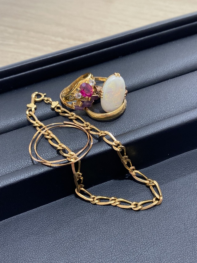 長岡市にお住まいの方から【K18 オパール付リング】【K18 紫石付リング】【アクセサリー K18 甲丸リング フープピアス チェーンブレスレット】【無刻印 石付リング】をお買取りさせていただきました。